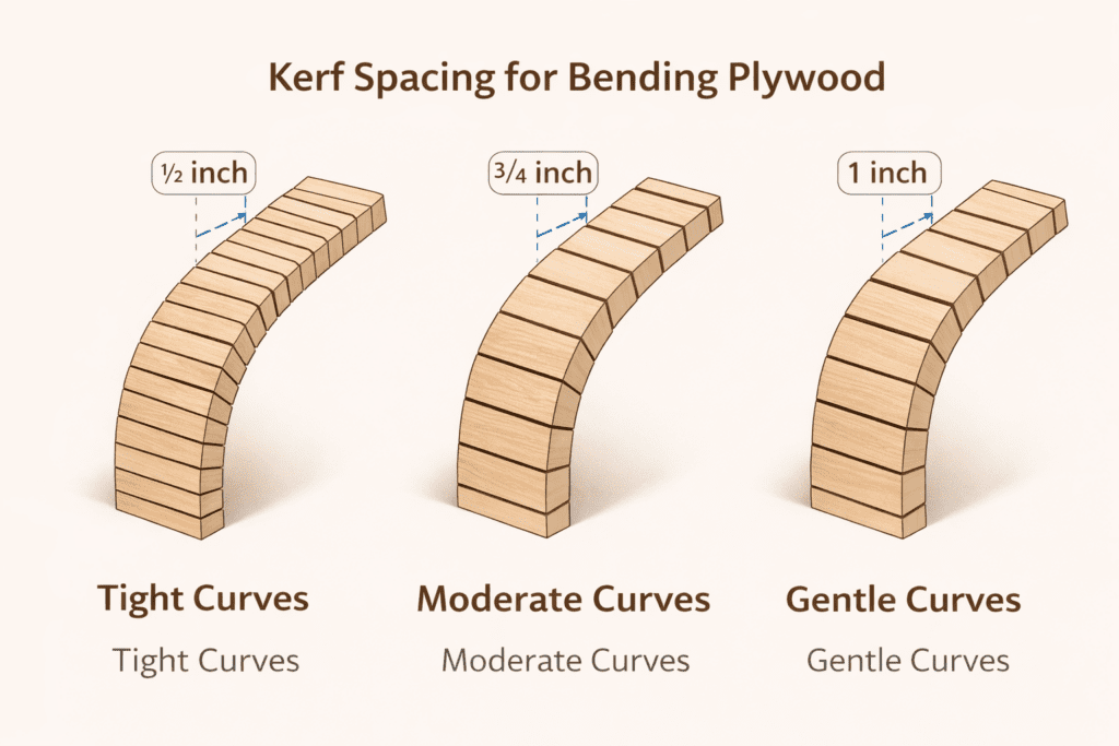The spacing of kerf cuts determines how smoothly the plywood will bend.