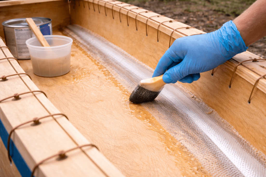 Epoxy is used throughout the build. It bonds the panels, seals the wood, and keeps water out. Some seams are reinforced with fiberglass cloth, while others are filled with epoxy thickened using wood flour or fiber. Both methods work when done properly.