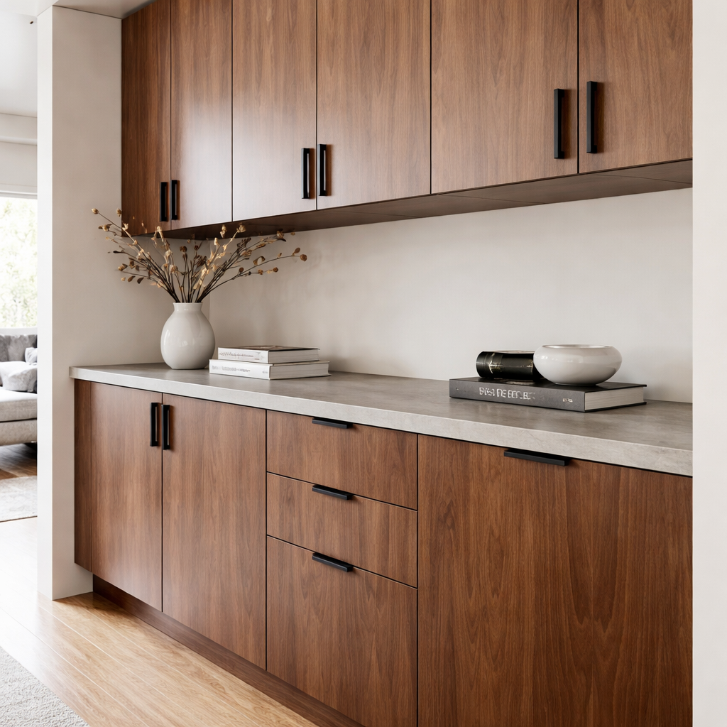 - Particleboard Core: Often maligned, but in high-end European cabinetry, a high-density industrial particleboard core is actually more stable than solid wood for large cabinet doors.
