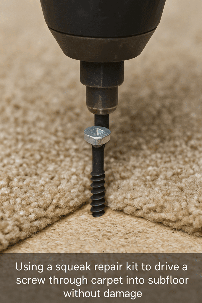 • Carpet: Used a Squeeeeek No More kit. Screw goes right through the carpet, pulls the floor down, and snaps off under the surface. No damage.