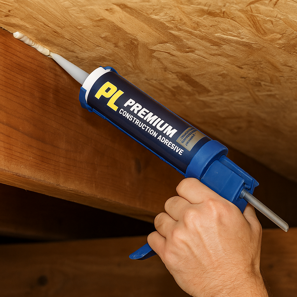 Adhesive is the “hidden hero” in squeak repair. Screws lock things together right now, but adhesive keeps the bond tight for years. Loctite PL Premium is my go-to because it’s strong, waterproof, and doesn’t get brittle. I run a bead along the joist before driving screws, and the plywood is rock solid afterward. Without glue, you may end up chasing the same squeak again later.