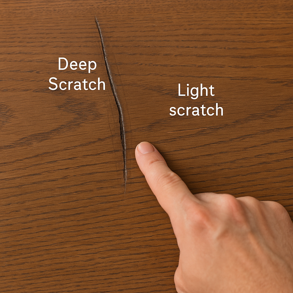 Be mindful that scratches can appear light when they are actually very deep. You can usually tell if a scratch is light or deep by running your hand along the scratch. If itâs a light scratch, you shouldnât feel an indent. If itâs a deep scratch, you may be able to feel the wood beneath.
