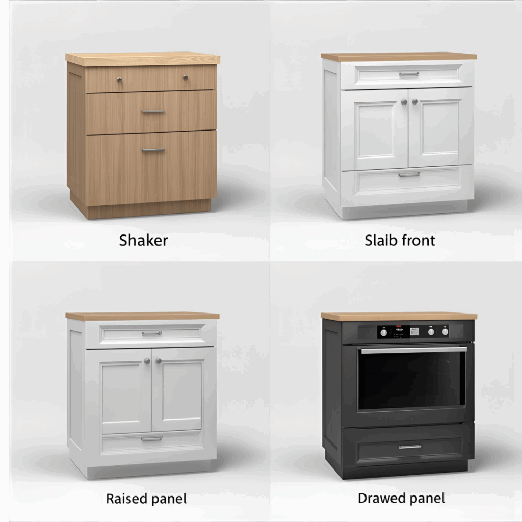 Slab front â modern and sleek. No panels, no fuss, just a flat door. Works great if you like a minimalist look or plan on painting everything one solid color. Easy to wipe down, too, which matters when the oven gets messy.