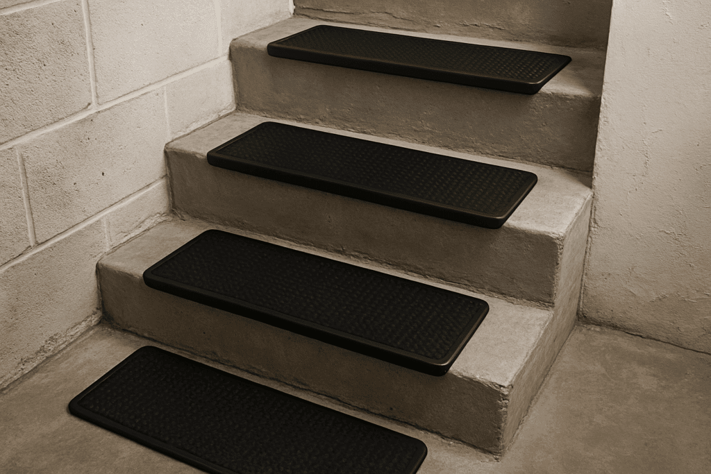 - Rubber treads work well in basements, garages, or workshops where safety is more important than looks. They hold up to dirt, spills, and heavy boots, and the slip-resistant surface means you can move around with confidence even when things get wet.