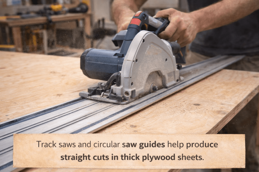 For professional accuracy, many builders prefer a track saw system such as the Makita track saw kit, which produces extremely clean plywood cuts and minimizes tear-out.