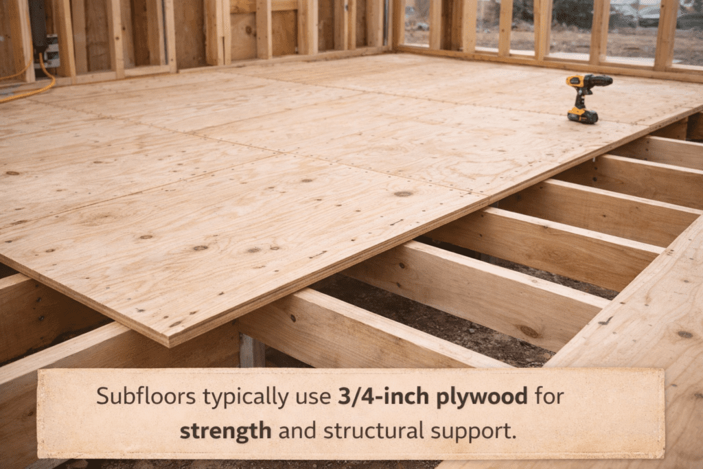 Most residential subfloor systems use 3/4-inch plywood installed over joists spaced 16 inches apart. Builders typically follow structural recommendations published by the APA Engineered Wood Association, which outlines span ratings for plywood and OSB floor systems.