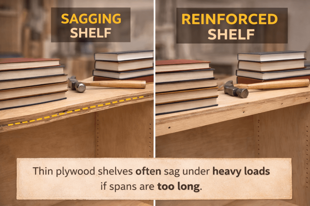 Builders often strengthen shelves by attaching a hardwood strip to the front edge of the plywood. This dramatically increases stiffness and prevents sagging.